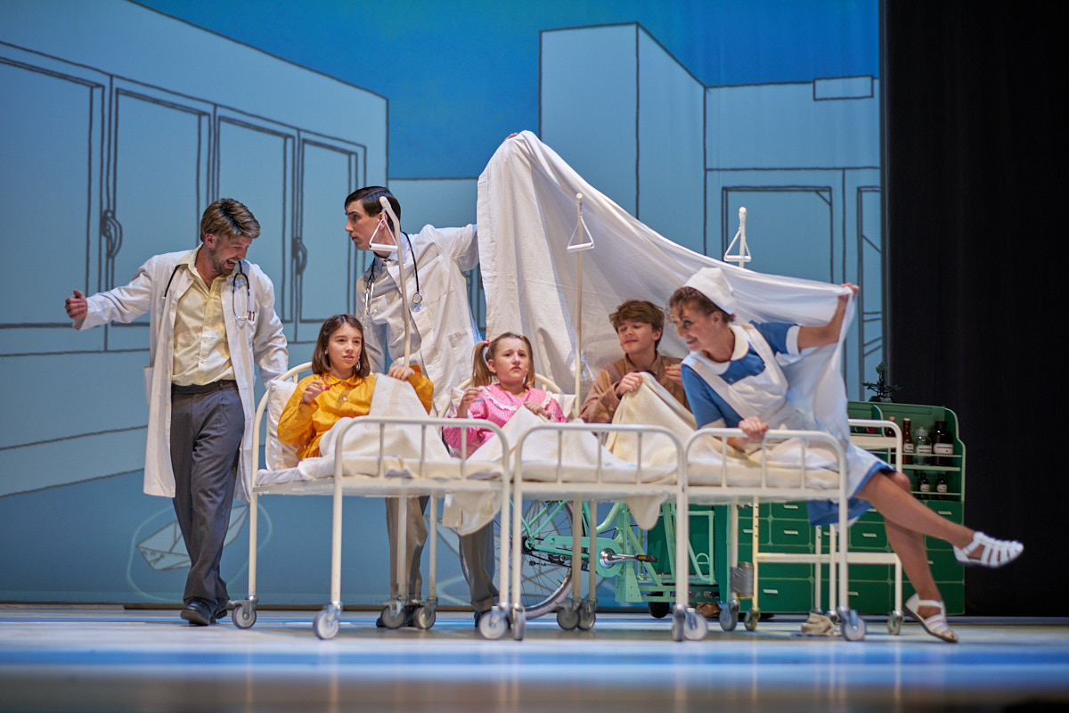 HIMMELTUNNERTORIA Ganz z' usserscht usse und änne am Rhy do liit es chliises Stuck Wält. Unser Schaffhausen damals eine andere Welt als heute. Es fuhr noch das Tram durchs Städtli, Büroarbeit wurde mit der Schreibmaschine erledigt und im Spital gabs eine Kinderstation in der Oberschwester Annegreth herrscht. Eine strenge Frau, die sich tagein tagaus um die kleinen Patientinnen und Patienten kümmert, doch trotz dem von ihr sorgfältigst geregeltem Spitalalltag läuft nie alles nach Plan. Am meisten Arbeit machen ihr die Assistenzärzte und Schwestern. Assistenzarzt Bieser ist Oberschwester Annegreth besonders ein Dorn im Auge. Er ist viel zu lässig und unpünktlich. Da vor den kleinen Patienten niemals Aufhebens gemacht werden darf, wenn etwas nicht so läuft wie sie sich das wünscht und schon gar nicht öffentlich geflucht werden soll, ertönt immer wieder "Himmeltunnertoria" durch die Zimmer und Gänge. So macht sich Annegreth Luft. Auch Selma möchte manchmal zum Himmel hoch schimpfen. Sie ist krank und das Kinderspital ihr zweites Zuhause. Regelmässig ist sie dort zur Dialyse. Eine Maschine hilft ihrem Körper bei der Blutreinigung. Das dauert lange, ist langweilig und ermüdend. Da kämen lustige Bettnachbarn im Spitalzimmer mit einem Gipsbein, einer Mandeloperation oder einem Blinddarm eigentlich gerade recht, bringen sie doch Abwechslung in den tristen Tag. Warum aber Freude und Freundschaften zulassen wenn doch gerade alles so blöd ist. Selma will nur noch auf ein Wunder warten. Dass es sich lohnt wird sich zeigen, denn alle auf der Station machen es immer wieder möglich, dass mit viel Geschick, Fantasie und ein paar Tricks nicht nur kleine sondern auch grosse Wunder passieren.
